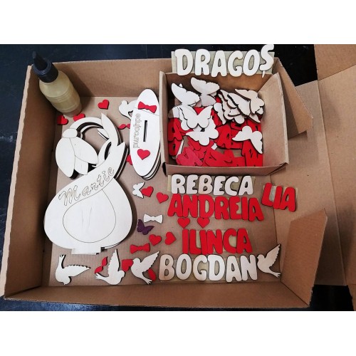 Include: piesa de baza din lemn, piesa care se imbina pentru suport sau sfoara de agatat, literele ce formeaza numele copilului, elemente de decor la alegere (flori, inimi, papioane, mustati, pasari, fluturi s.a.)