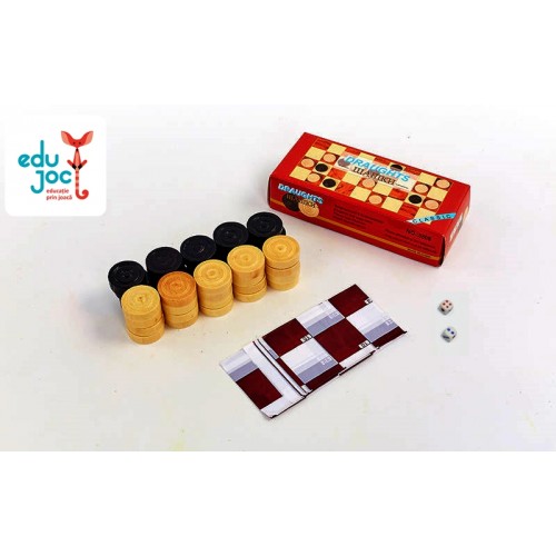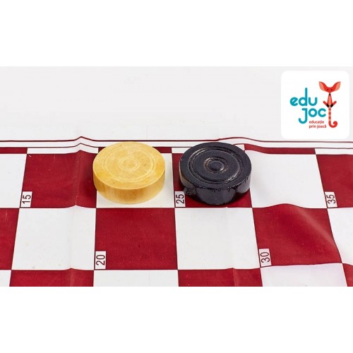 Jocul contine: cutie din carton, 20 piese din lemn culoarea neagra si 20 culoarea alba, 2 zaruri, tabla de joc din pelicula.