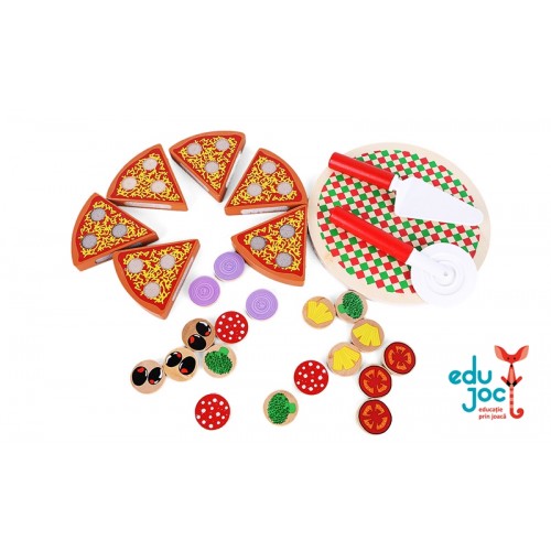 Pizza include: felii de pizza, blat, toppinguri, 2 instrumente feliere, servire pizza (instrumentele sunt din plastic)