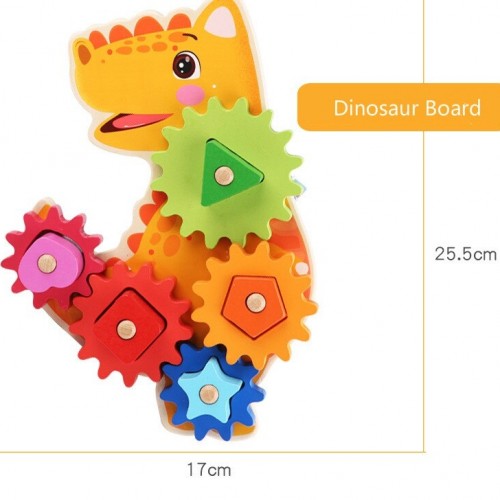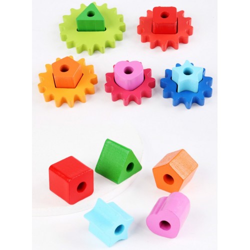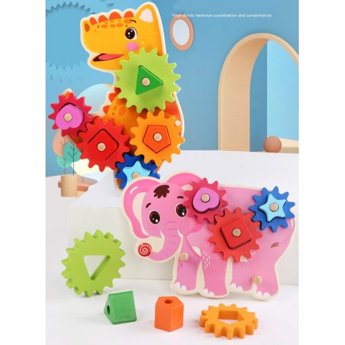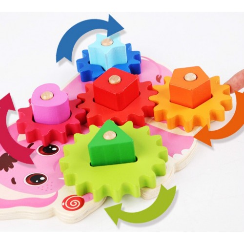 Elementele colorate din lemn sunt conectate prin roti dintate. Copiii au parte de primul contact cu mecanismele si incearca sa gaseasca cea mai buna combinatie de elemente din lemn pentru a face toate rotile sa se invarte, prin miscarea unuia singur.